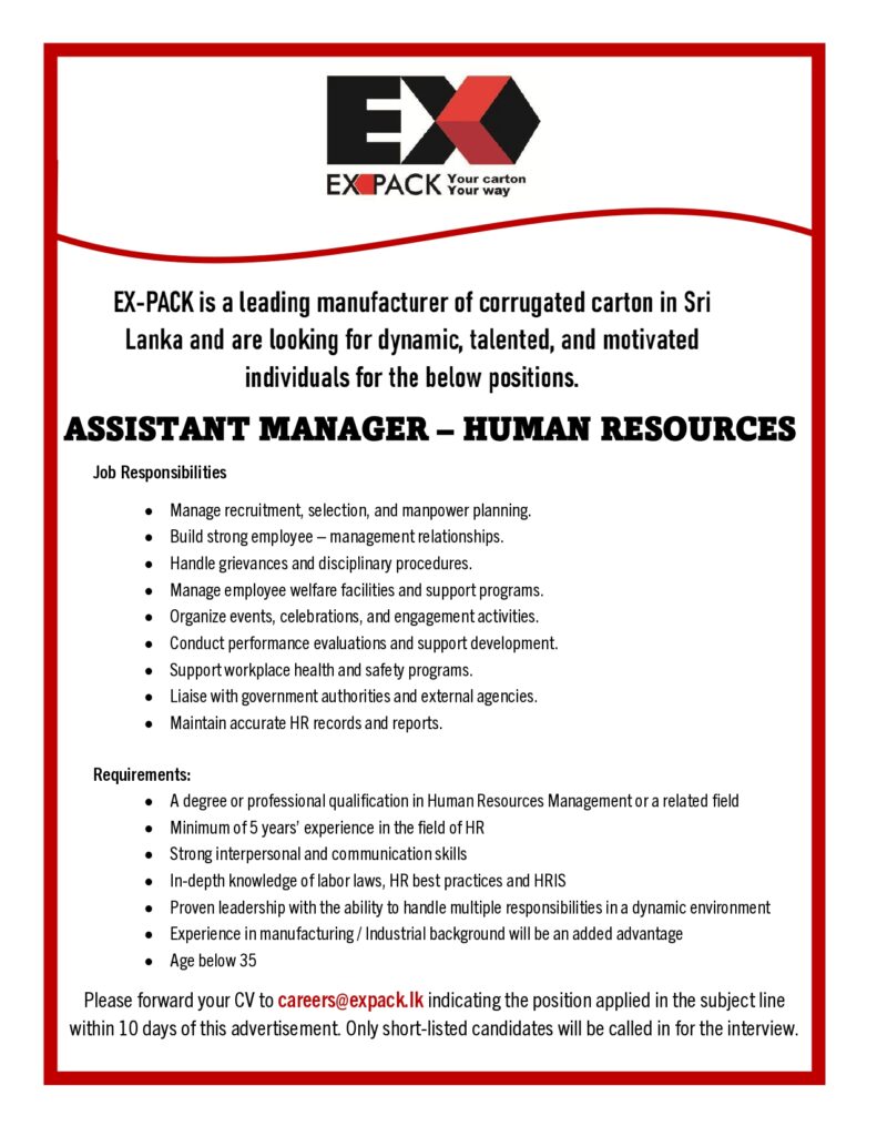 Assistant Manager – Human ResourcesBy roadhog777 / September 26, 2025 Full TimeColomboPosted 2 months ago Expack To apply for this job email your details to careers@expack.lk Get back to careers