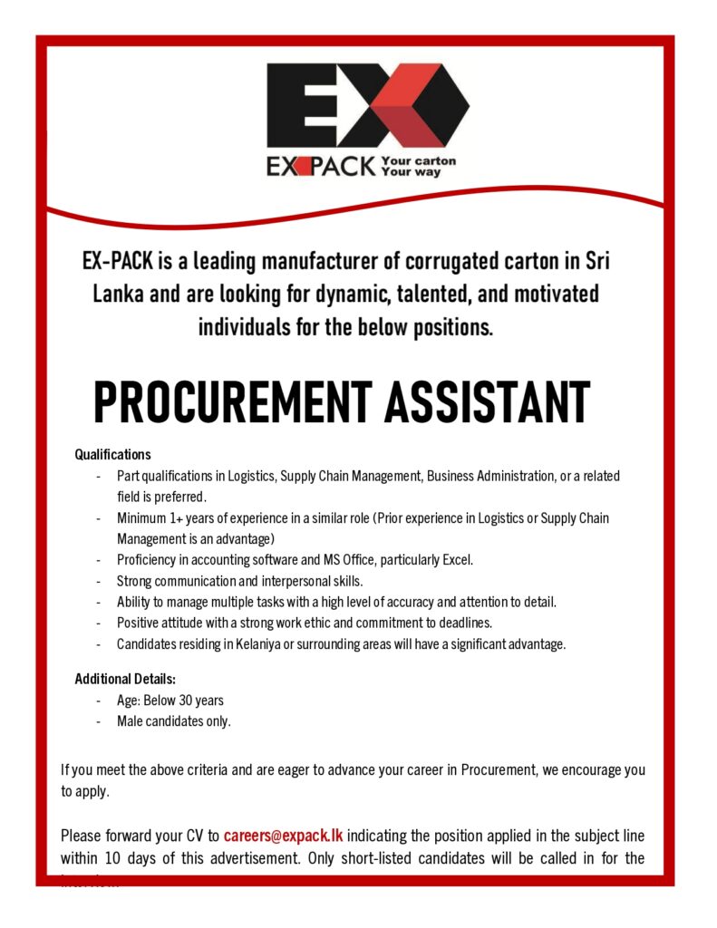 PROCUREMENT ASSISTANTBy roadhog777 / September 26, 2025 Full TimeColomboPosted 5 months ago Expack To apply for this job email your details to careers@expack.lk Get back to careers